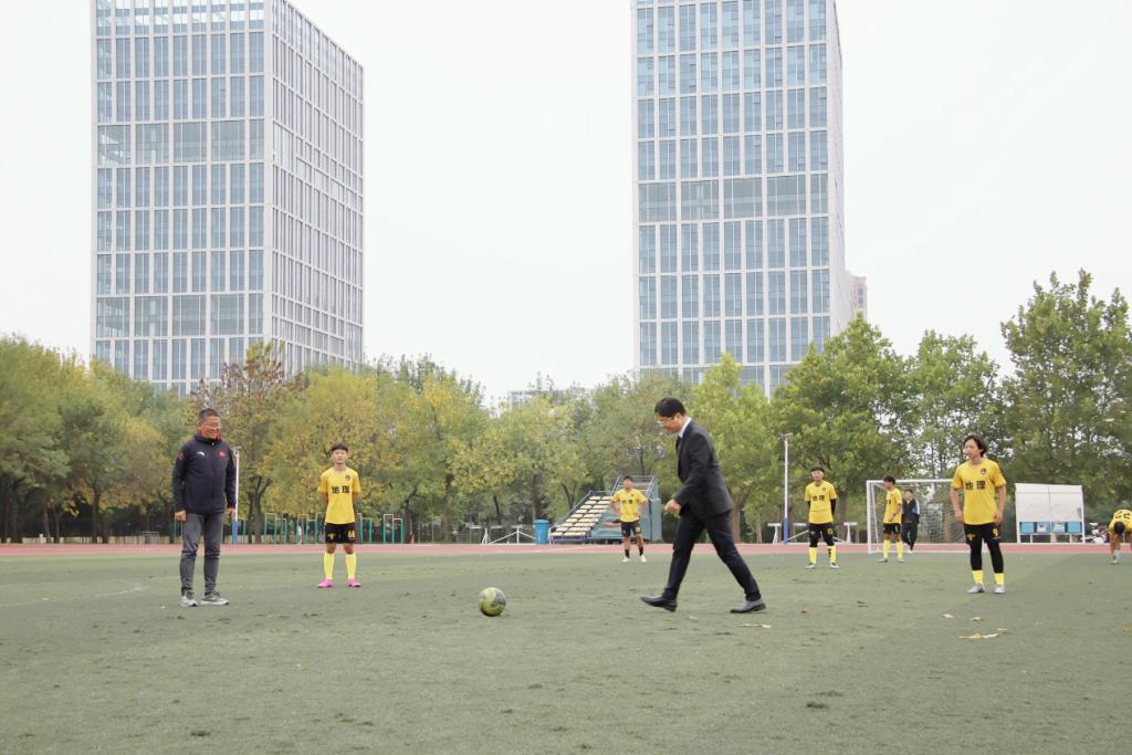 最后,刘刚为足球表演赛开球,拉开了本届体育文化节的序幕。体育教学部主任杨弢、经济学院党委书记赵杰以及相关部处领导、各院系党委副书记和辅导员参加了开幕式。