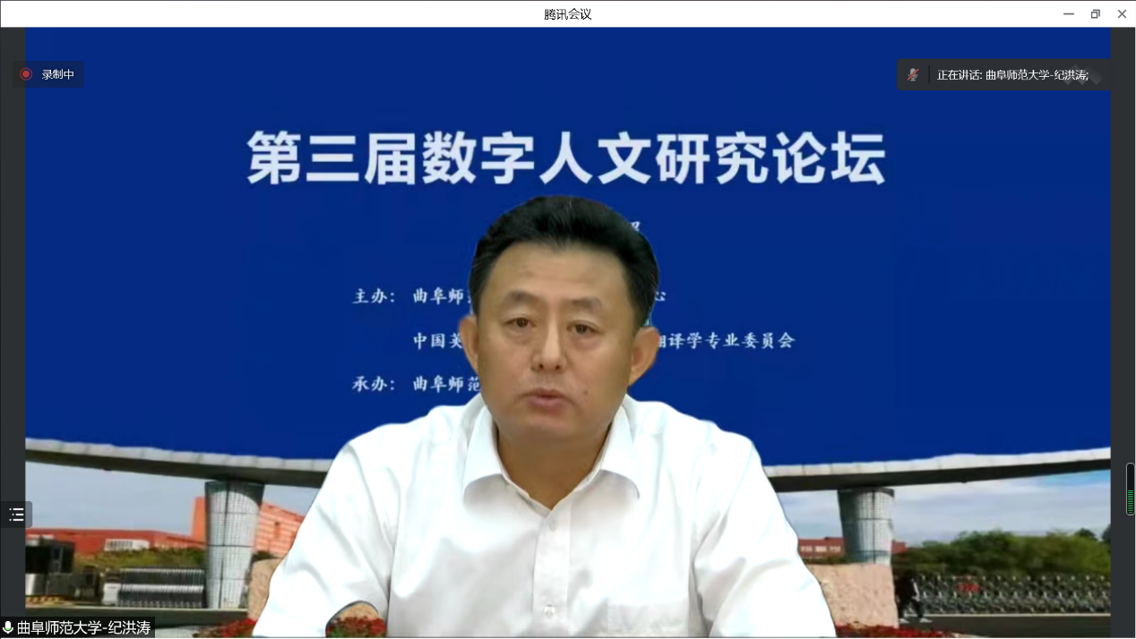 曲阜师大新闻中心讯(通讯员:张涛) 日前,第三届数字人文研究论坛在华体会官方网举办。本次论坛由曲阜师大数字人文研究中心与中国英汉语比较研究会语料库翻译学专业委员会联合主办,曲阜师大翻译学院与上海外语音像出版社承办。来自北京外国语大学、上海外国语大学、台湾辅仁大学、北京航空航天大学、上海交通大学、北京师范大学等数十所高校的数字人文研究专家齐聚云端,共同分享数字人文研究的新成果、新进展。华体会官方网党委常委、副校长纪洪涛出席论坛开幕式并致辞。开幕式由曲阜师大翻译学院院长夏云教授主持。