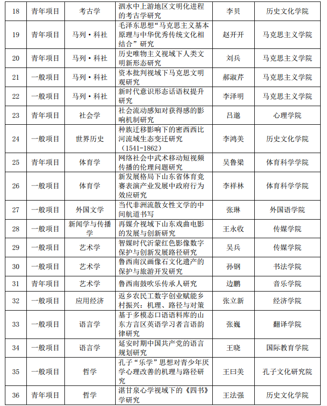 曲阜师大本年度立项项目覆盖学科多,分布学院广,涉及管理学、教育学、考古学、理论经济、马列·科社、社会学、世界历史、体育学、外国文学、新闻与传播学、艺术学、应用经济、语言学、哲学、政治学、中国文学等学科和领域。立项项目分布于21个学院和科研机构,其中教育学院5项,马克思主义学院4项,传媒学院、管理学院、历史文化学院各3项,基础教育课程研究中心、教育大数据研究院、经济学院、孔子文化研究院、体育科学学院、文学院、政治与公共管理学院各2项,国际教育学院、计算机学院、继续教育学院、期刊中心、书法学院、外国语学院、心理学院、音乐学院、翻译学院各1项。项目类别实现全覆盖,其中,青年项目占比达到36.6%,青年人才的科研能力有了明显提升。