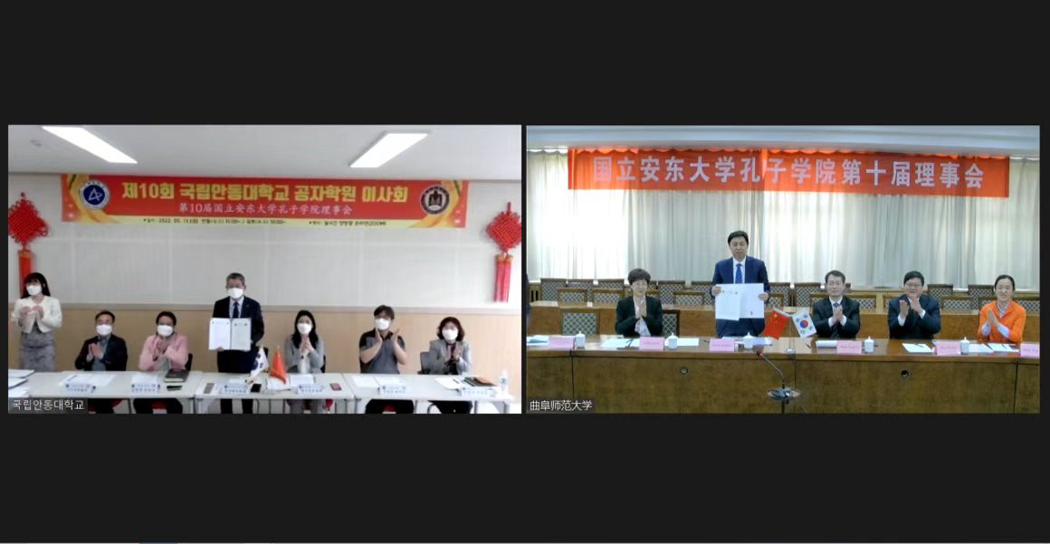 曲阜师大新闻中心讯 5月13日,华体会官方网与韩国国立安东大学以视频方式召开了国立安东大学孔子学院第十届理事会。曲阜师大校长张洪海,国立安东大学校长权纯泰出席会议,安东孔院韩方院长金炳圭、中方院长王秀卿以及中外方理事会成员、孔子学院相关工作人员参加了会议。
