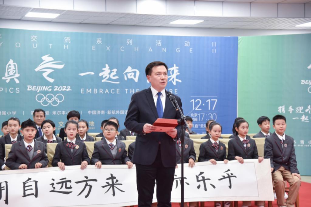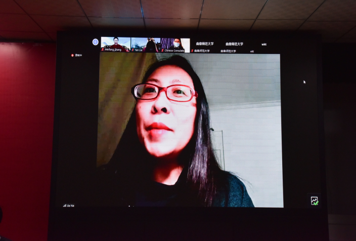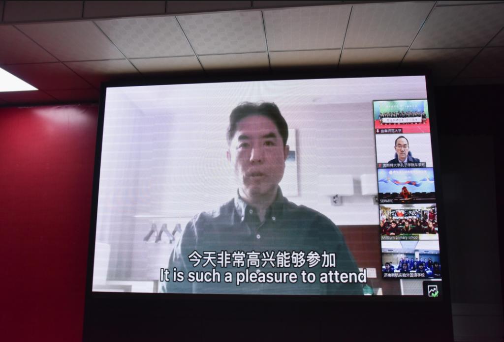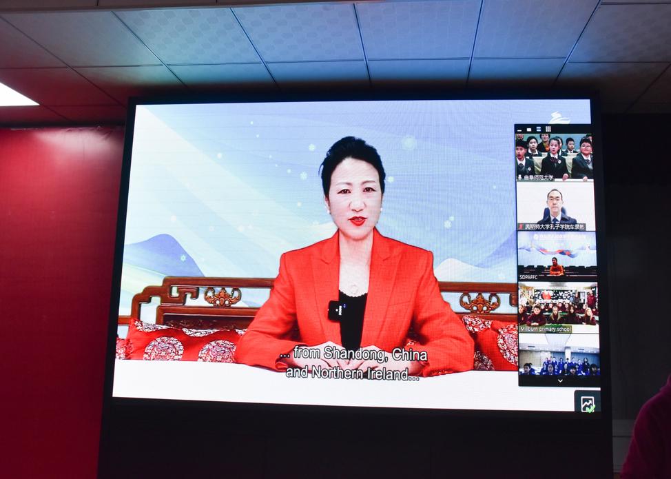 中国驻贝尔法斯特总领馆总领事张美芳,山东省人民对外友好协会秘书处处长周卫,英国驻华大使馆北爱事务局中国区行政总监贾娜,华体会官方网党委常委、副校长屈跃宽分别致辞,表达对于两国三地青少年交流的美好期待,共同祝福北京冬奥会及中英两国友谊。