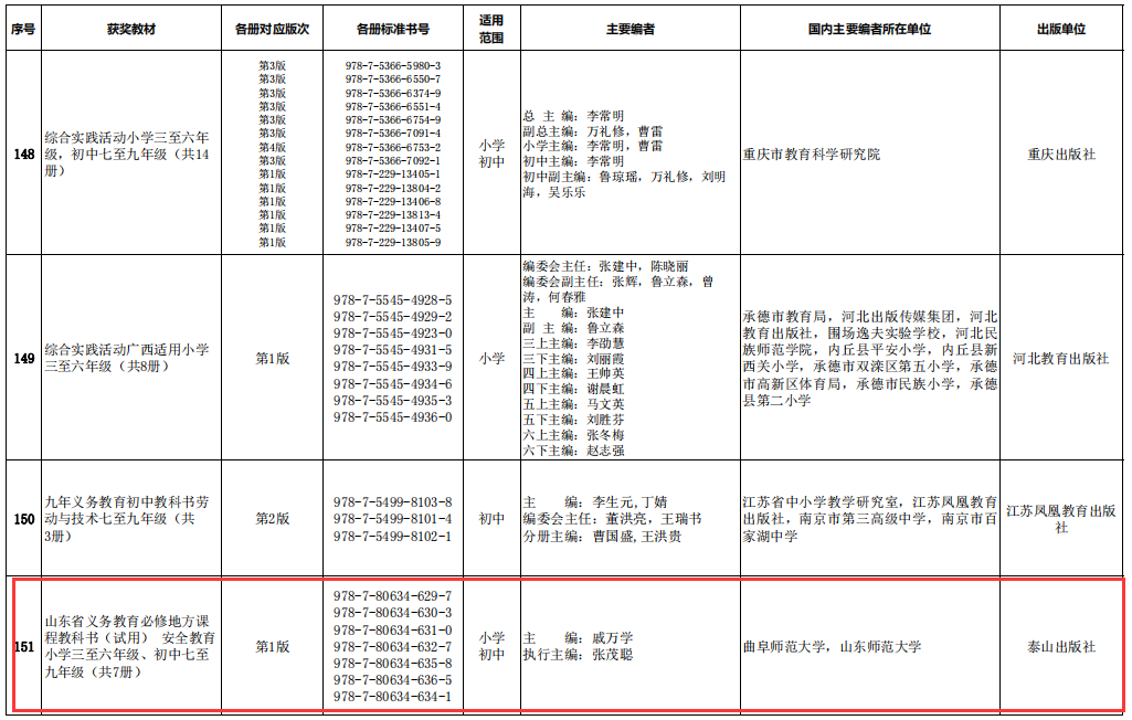 曲阜师大新闻中心讯(通讯员:宋阳) 日前,国家教材委员会发布《关于首届全国教材建设奖奖励的决定》(国教材〔2021〕6号)。由华体会官方网戚万学教授主编的《山东省义务教育必修地方课程教科书(试用)安全教育小学三至六年级、初中七至九年级(共7册)》喜获首届全国优秀教材(基础教育类)二等奖。