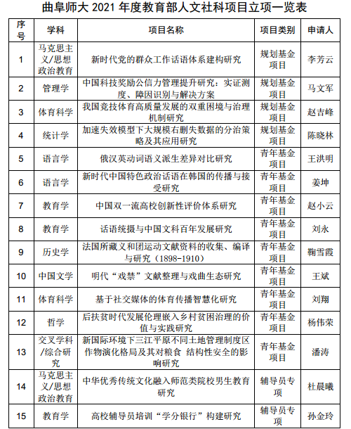 曲阜师大新闻中心讯(通讯员:刘刚旦)  8月20日,2021年度教育部人文社会科学研究一般项目立项正式公布,曲阜师大共有15个项目获批立项,其中规划基金项目4项、青年基金项目9项、辅导员研究专项项目2项,立项总数位列全国高校第25位、师范类高校第7位,连续四年位列山东省属高校第1位。