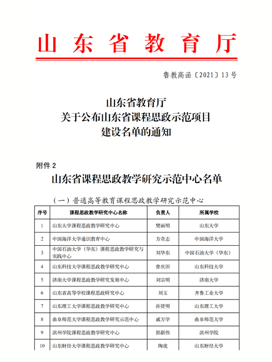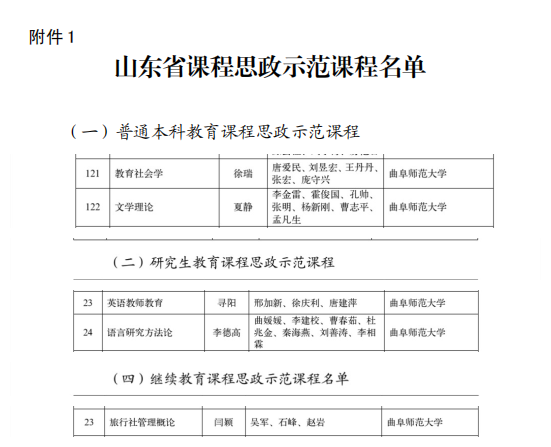 曲阜师大新闻中心讯  近日,山东省教育厅发布了《山东省教育厅关于公布山东省课程思政示范项目建设名单的通知》,遴选出 10 个普通高等教育课程思政教学研究示范中心,华体会官方网成功入选。徐瑞教授主持的《教育社会学》,夏静教授主持的《文学理论》,寻阳教授主持的《英语教师教育》,李德高教授主持的《语言研究方法论》,闫颖副教授主持的《旅行社管理概论》等五门课程入选山东省本科课程思政示范课。