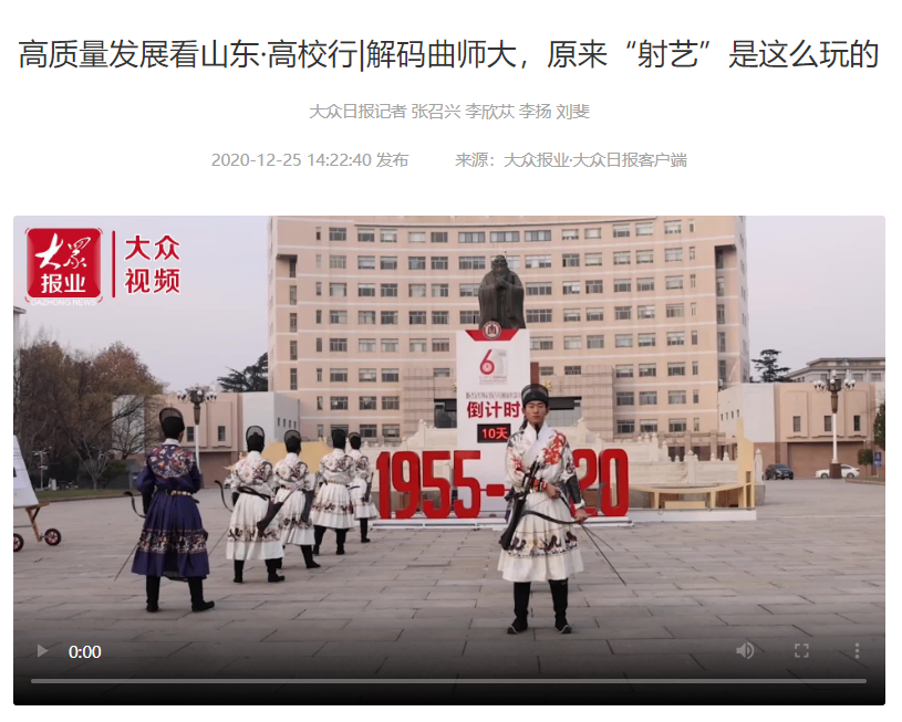 曲阜师大新闻中心讯  在收官“十三五”、开启“十四五”之际,七篇关于曲阜师大的深度报道,陆续在大众日报全媒体矩阵全网发布,“学习强国”平台转发。《会客厅·书记校长访谈录|戚万学:坚持“以文化人”,构建传统文化育人特色体系》、《高质量发展典型案例|华体会官方网:守正创新以文化人,推动人文社科领域特色科研发展》、《1+25+6000!解密曲师大“慢功夫”背后的育人密码》、《听说曲师大有个“网红”教师博物馆,带你去瞧瞧》、《让传统文化教育“活起来”,这所高校有多拼?》、《解码曲师大,原来“射艺”是这么玩的》等多篇报道,通过书记访谈、典型案例、短视频、创意海报等形式,讲述了扎根孔子故里,守正创新,坚定不移走好特色发展道路,高质量发展的曲园故事!