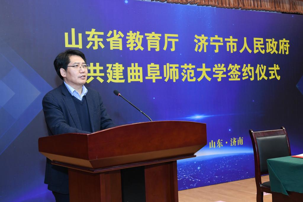 邓云锋在签约仪式上致辞,他指出,在新时代山东高等教育高质量发展的大好背景下,济宁市政府与省教育厅共建曲阜师大,对于实施教育强省、促进高等教育高质量发展将产生积极影响。近年来,济宁市坚定不移贯彻教育优先发展战略,全力打造鲁南经济带教育高地。曲阜师大事业发展跑出了令人瞩目的“曲师速度”,综合办学实力稳居省属高校第一方阵。市、校双方不断深化合作的深度和广度,已成为紧密的“命运共同体”。此次签署共建协议将进一步推动省、市、校三方携手并肩、共同发力,促进曲阜师大高质量发展,进而更加有力地支撑全省高等教育均衡发展,服务济宁经济社会发展。省教育厅将在一流学科、一流大学、一流专业、教学科研平台建设等方面给予学校重点支持;希望曲阜师大以省市共建为重要契机,增强发展信心,凝聚发展力量,领会共建精神,放大共建效应,对标国内同类一流高校,在赶超进位中实现新跨越;实施名校名城战略,为济宁乃至全省经济社会高质量发展作出新的更大贡献。