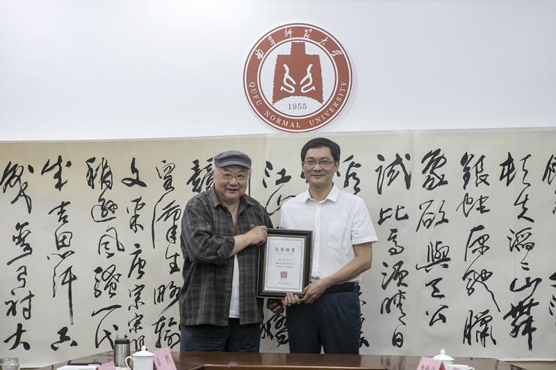 座谈会上,九三学社社员、著名画家高天祥,捐出本人精心创作的书画作品,倡议广大师生校友踊跃捐献精品力作,丰富我校美术馆馆藏、迎接建校65周年;济宁市政协常委、书法学院教授乌峰,向学校捐赠价值十余万元的文化景观,倡议全校师生行动起来、共同建设美丽曲园。夏云杰代表学校为两位捐赠者颁发荣誉证书。