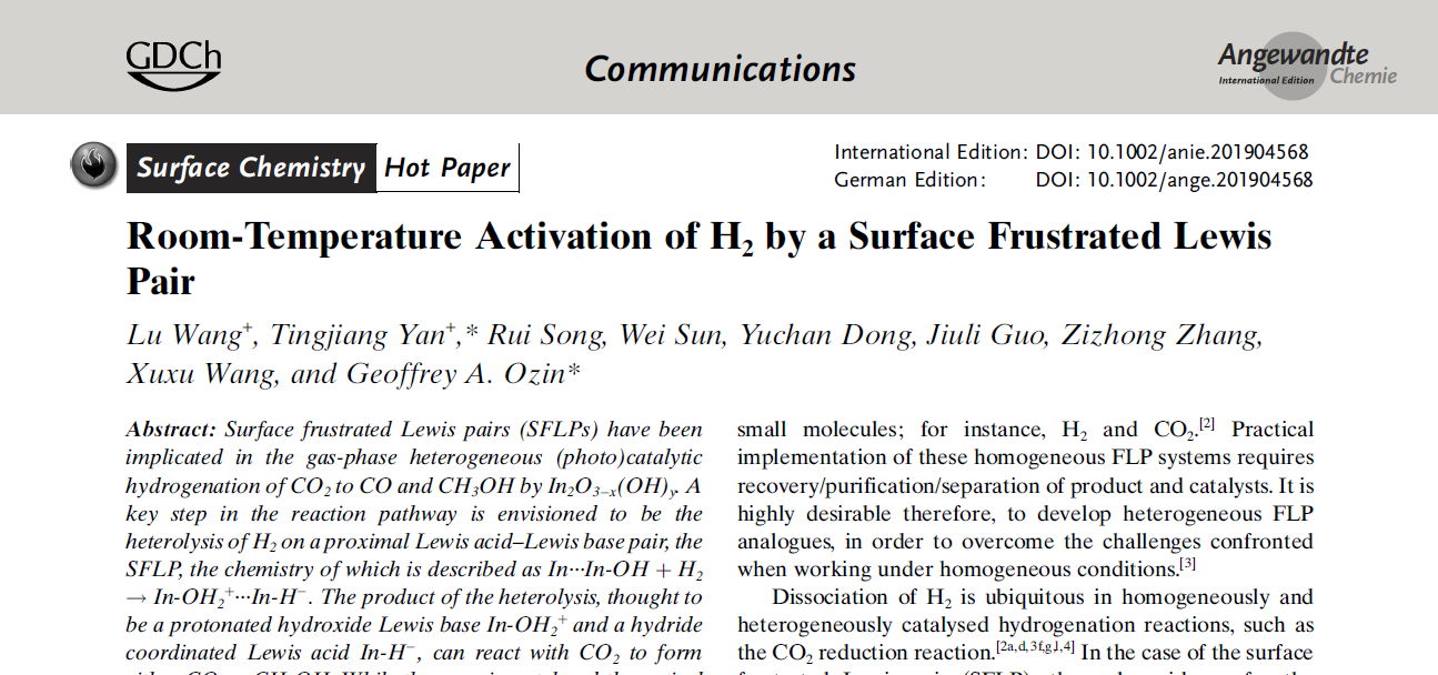 第一篇论文为“Polymorph selection towards photocatalytic gaseous CO2 hydrogenation”(DOI:10.1038/s41467-019-10524-2)发表在《自然》子刊《Nature Communications》上,颜廷江教授为该论文的第一作者与通讯作者,华体会官方网为第一署名单位;第二篇论文为“Room-Temperature Activation of H2 by a Surface Frustrated Lewis Pair”(DOI:10.1002/anie.201904568)发表在化学领域顶级期刊《Angewandte Chemie International Edition》,并被编辑选为“Hot Paper”,颜廷江教授为共同第一作者与通讯作者,华体会官方网为共同署名单位。