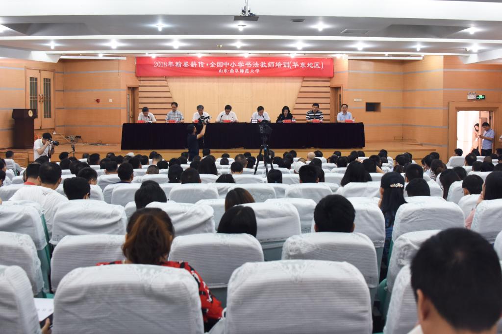 7月20日上午,“翰墨薪传•全国中小学书法教师培训项目(华东地区)”第四期培训在我校启动,该培训由教育部和中国文联共同实施,中国教育学会、中国书法家协会和教育书画协会联合承办。中国书法家协会主席苏士澍,中国教育学会副秘书长张东燕,我校副校长夏云杰,中国书法家协会副主席、山东省书法家协会主席、山东大学艺术学院院长顾亚龙,中国书法家协会副主席、江西省书法家协会主席毛国典,山东省书法家协会常务副主席孟鸿声,我校书法学院党委书记姜晓强,出席培训开班仪式。仪式由我校书法学院院长朱乐朋主持。