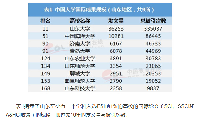 在国际成果规模方面,根据Web of Science中10年发文量和总被引次数的统计,我校以2790篇发文量和19052次总被引次数,名列山东高校第8位。