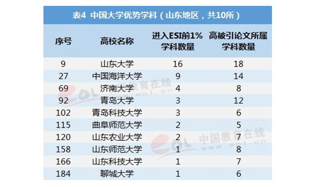 在优势学科方面,我校目前有2个学科进入ESI前1%,高被引论文所属学科数量共有5个学科,名列山东高校第6位