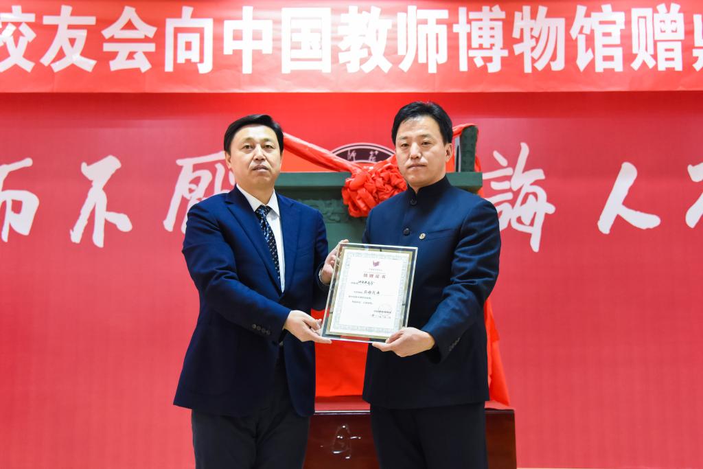 校长张洪海向河南校友会副秘书长、我校中文系1987级校友李国颖颁授捐赠证书