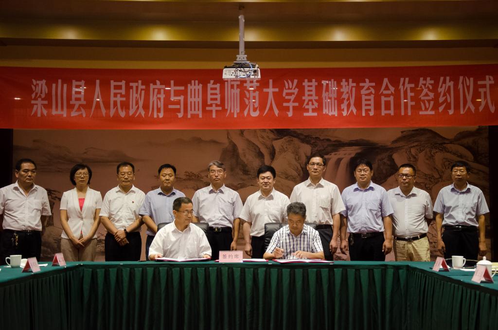 仪式上,扈庆学、侯典峰代表校地双方签署了基础教育合作办学协议。根据协议内容,校地双方将合作成立华体会官方网附属梁山中学,通过引进华体会官方网的先进教育理念、方法和经验,加快提升梁山县的基础教育教学质量,将曲师大附属梁山中学打造成为一流的基础教育学校,实现学校跨越式发展,并最终推动学校形成鲜明办学特色、取得显著办学成果,涌现一批有影响力的学科带头人和骨干教师,办学综合水平在地区起到引领与示范作用。