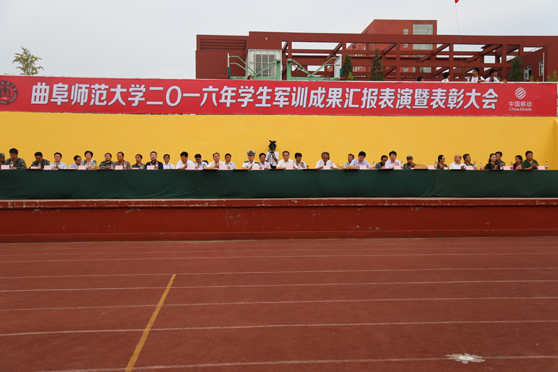 出席曲阜校区军训成果汇报表演暨表彰大会的领导有:我校党委书记荆兆勋,副校长张洪海,山东陆军预备役炮兵师侦查科科长杨云国中校,以及学校各部门、各学院主要负责同志。大会由学生工作处处长、武装部部长、军训团团长杨永明主持。