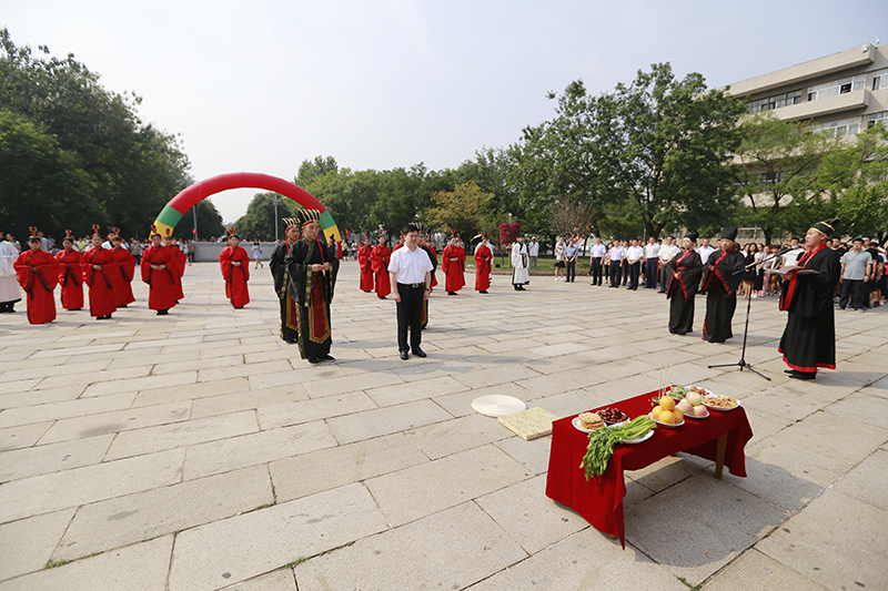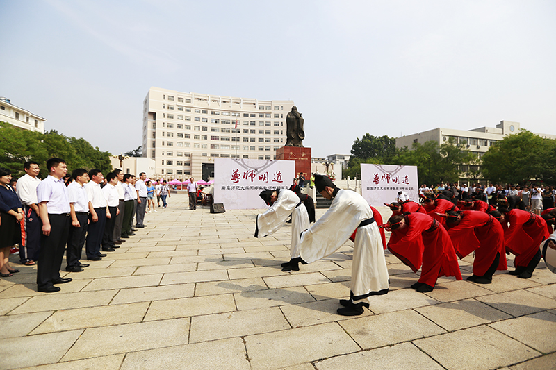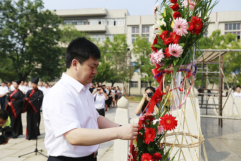 9月9日上午,我校师生在孔子文化广场举行传统文化礼仪“释菜礼”,拜祭至圣先师孔子,弘扬尊师重教传统,迎接第32个教师节的到来。校长戚万学出席仪式,向至圣先师孔子像敬奉花篮。