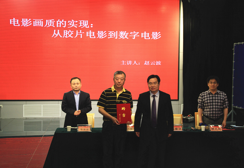 5月12日下午,山东电影制片厂创作室主任、一级摄影师赵云波先生兼职教授聘任仪式暨“电影画质的实现:从胶片电影到数字电影”学术讲座在我举行。日照校区管委会主任助理、日照校区管理办公室主任池福安出席仪式并为赵云波先生颁发兼职教授聘书。传媒关负责人、专业老师、艺术类专业研究生、相关专业本科生等170余人出席仪式并聆听了报告。聘任仪式由传媒学院院长马秀峰主持