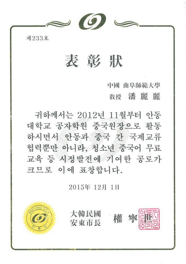 权宁世市颁奖时指出,潘院曲阜范大派往安孔院的首任中方院, 去三年多的时间里,舍小家大家,在市中小生普及中文化知立安少年汉语教学中心、促东与国济缔结友好交流城市、促市多所中学与国学结为姊校以及规划韩学术及文化交流等方面做出了积极贡献的全面展奠定了坚实的力量。潘院在出色地完成了中方院工作的同,也以及整区与的友好交流做出了突出贡献