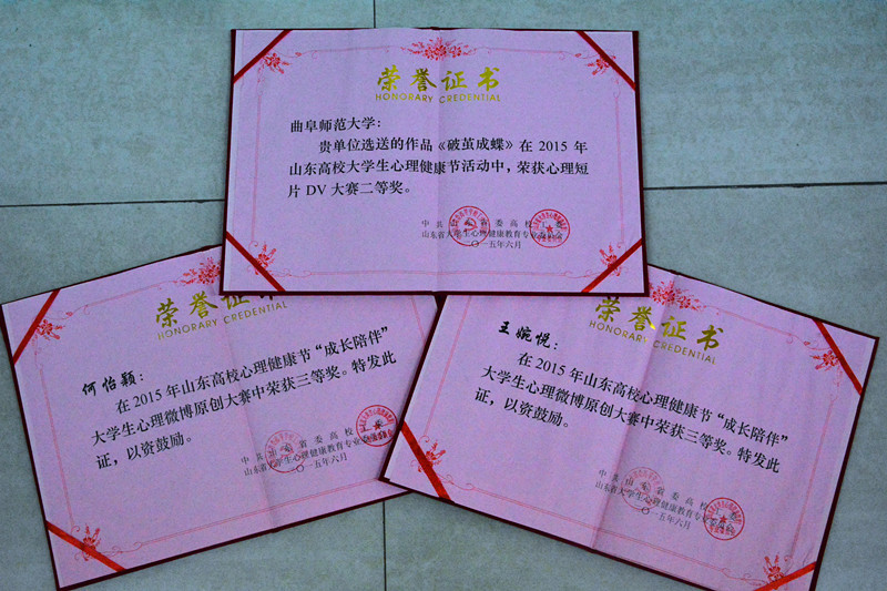 6月15日,山东省大学生心理健康教育专业委员会2015年学术年会在山东大学召开,山东省委高校工委副书记黄琦出席会议并讲话。会议对2015年山东高校大学生心理健康节优秀组织单位、优秀指导教师、获奖项目及获奖作品进行表彰。我校被评为“山东省2015年大学生心理健康节优秀组织单位”,心理DV作品《化茧成蝶》获得心理短剧DV大赛二等奖。王婉悦、何怡颖的微博获大学生心理微博原创作品三等奖。