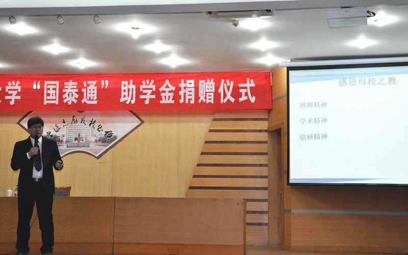 演讲之前,举行了“国泰通”助学金捐赠仪式。副校长扈庆学,学生工作处、招生就业处、校团委、体育科学学院等单位负责人出席活动,仪式由校党委办公室主任夏云杰主持。扈庆学在讲话中充分肯定了孙国成校友的杰出成绩,以及其对母校的慷慨捐赠和拳拳情意,代表学校接受其十五万元人民币的捐款。孙国成也表达了自己对母校的深深眷恋之情和感恩之心,并表示会一如既往地关心学校的发展,加强与学校的联系与合作。仪式上,孙国成与我校签订了华体会官方网“国泰通”助学金合作协议书,并受聘为我校就业创业导师。“国泰通”助学金的设立旨在表彰家庭贫困、品学兼优的优秀学子,首批50名同学获得资助与表彰。