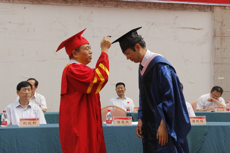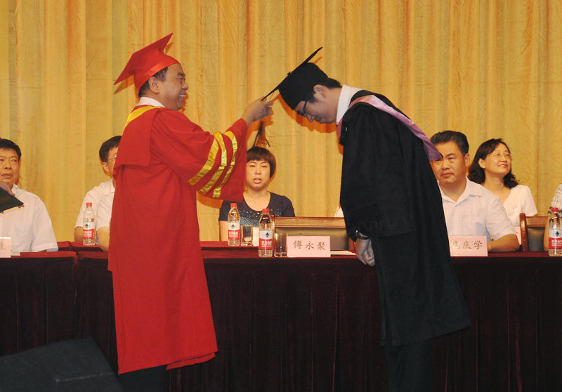在优美的音乐声中,校长傅永聚为2014届毕业生代表颁发毕业证书、学位证书,拨正流苏。