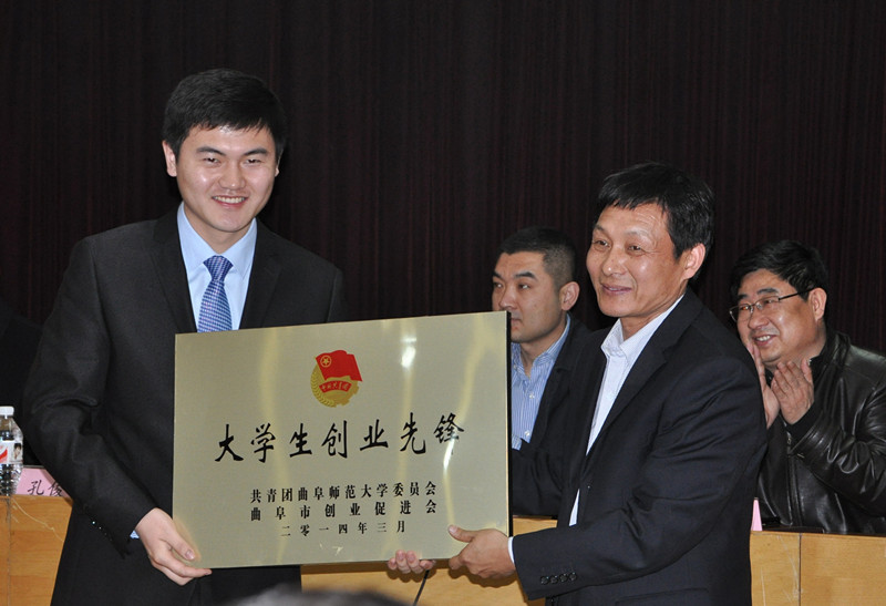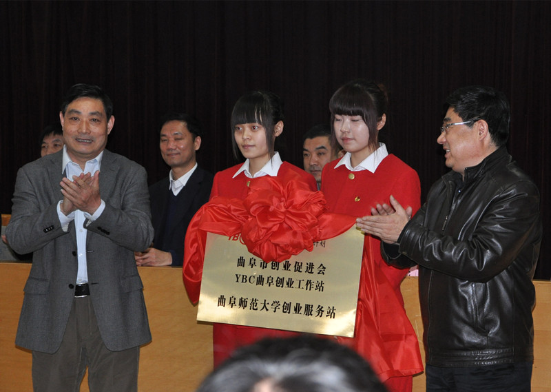 仪式上,孙文亮、曲阜市创业促进会会长袁炳新共同为YBC创业服务站揭牌,曲阜市人力资源与社会保障局副局长刘成震为大学生创业先锋授牌。济宁联通公司副总经理姚东,大学生创业先锋、“百立校园餐饮”公司经理鲁慧分别作了发言。
