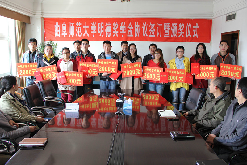 3月18日上午,“明德奖学金”协议签订暨颁奖仪式在我校举行。党委书记荆兆勋、党委副书记孙文亮、纪委书记郭辰夫,山东明德物业管理集团董事长刘德明出席了仪式,学校办公室、宣传部、学生工作处、团委、日照校区管理办公室和校区学生工作办公室等单位负责人及各学院师生代表参加仪式。