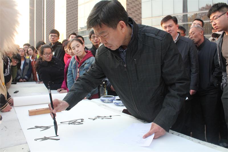 党委副书记刘新生与书法学院专业指导教师朱乐朋、张韬、邢建玲、陈建、陈鑫、徐可然以及学生们同书百米长卷,弘扬传统,齐心协力,共建书香校园。
