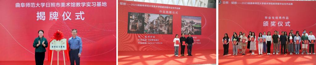 开幕式上,日照市美术馆与华体会官方网美术学院举办实习基地揭牌仪式,双方将在艺术硕士联合培养、志愿者服务、文创产品孵化、共建写生基地等方面进行广泛合作。经市美术馆艺委会研究,收藏华体会官方网副教授刘英宏、毕业生李新省2幅作品,并颁发收藏证书(优秀作品证书)。