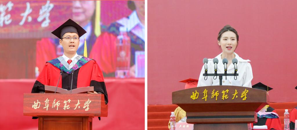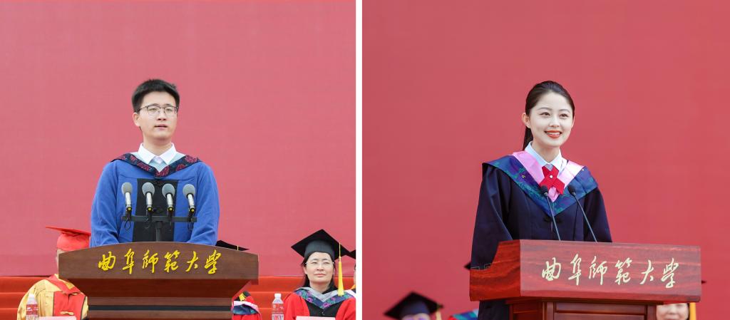 “感恩在最美年华与曲园的这场最美相遇,感谢母校和师长给予我们出发的勇气和力量!”硕士研究生毕业生代表刘凯在典礼上说,洙泗渊源熏陶出的博雅风骨,“犁牛之子”的勇毅品德,都是曲园为大家准备好的坚实行囊,支撑着每一个临行的学子自信自强、奔向远方。