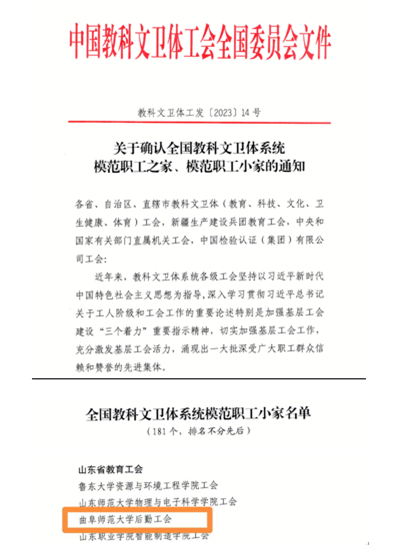 后勤管理处讯 近日,中国教科文卫体工会全国委员会发布了《关于确认全国教科文卫体系统模范职工之家、模范职工小家的通知》,华体会官方网后勤工会荣获“全国教科文卫体系统模范职工小家”荣誉称号。
