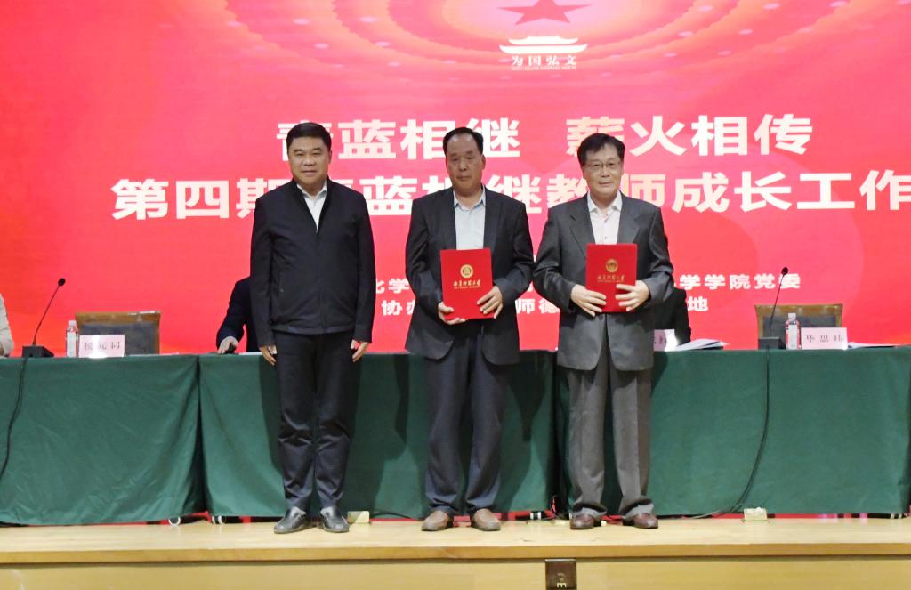 化学与化工学院毕思玮教授、生命科学学院侯元同教授受聘第四批“青年教师成长导师”,党委书记邢光为两位成长导师颁发证书。