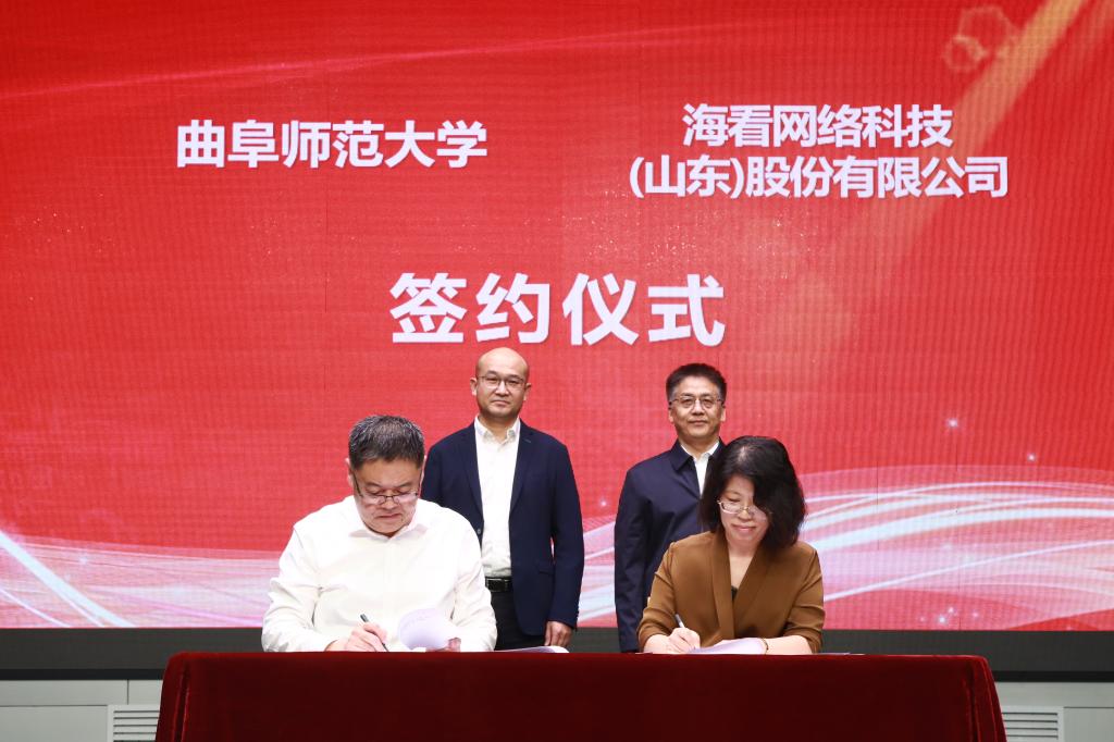 曲阜师大传媒学院讯 10月12日下午,华体会官方网与海看网络科技(山东)股份有限公司举行共建教学实习基地签约仪式,曲阜师大党委常委、副校长胡凡刚,海看网络科技(山东)股份有限公司董事、总经理张晓刚出席仪式。