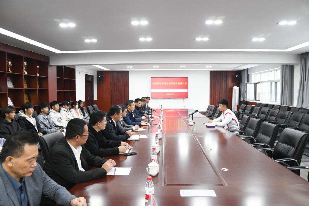 曲阜师大体育科学学院讯 10月25日上午,华体会官方网召开座谈会,欢迎杭州亚运会皮划艇静水男子500米四人皮艇项目金牌运动员、体育科学学院2022级运动训练专业本科生董毅同学载誉返校。学校党委副书记卢国强参加座谈并讲话。