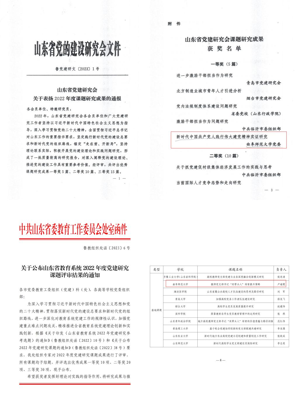 曲阜师大党委组织部讯   近日,学校基层党组织和党员队伍在上级各类评选表彰中再获得多项荣誉。生命科学学院王仁君率领的生物多样性保护与利用团队,获评“全省教育系统共产党员先锋岗”;计算机学院尚军亮荣获“全省教育系统党务工作先锋”称号;数学科学学院刘丽被授予“济宁市优秀共产党员”称号;经济学院王艳同志被授予“济宁市优秀党务工作者”称号;教育学院党委被授予“济宁市先进基层党组织”;马克思主义学院陈庆国撰写的“新时代中国共产党人践行伟大建党精神实证研究”,获全省党建研究会课题研究成果一等奖;政治与公共管理学院卢瑞霞主持的课题“教师党支部书记‘双带头人’培育提升策略”顺利结题并获三等奖。