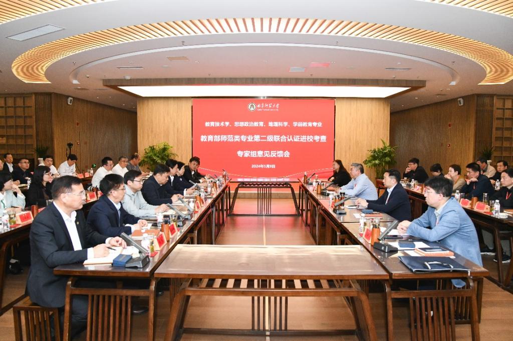 5月9日上午,教育技术学、思想政治教育、地理科学、学前教育专业分别召开专业反馈会。各专业专家组成员围绕专业建设发展成果、发展特色、存在问题、改进建议等逐一进行个人意见反馈,四个专业所在学院的专业负责人分别作表态发言,表示将聚焦专家反馈意见,逐条研究,认真分析,立行立改,把师范类专业认证内化为持续改进的实际环节,进一步建立健全面向产出的高质量师范类专业人才培养体系。专业意见反馈会结束后,学校层面专家考查意见反馈会在曲阜校区中国教师博物馆会议室召开。联合认证专家组全体成员、山东省教育科学研究院认证工作组领导、学校领导班子全体成员参加会议。反馈会由叶忠主持。