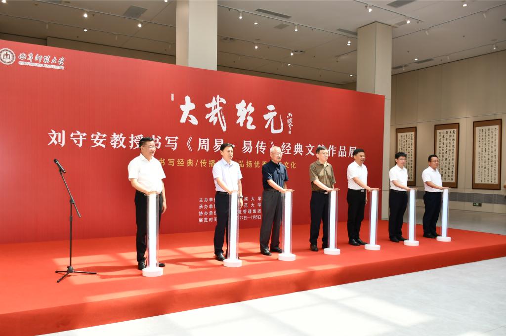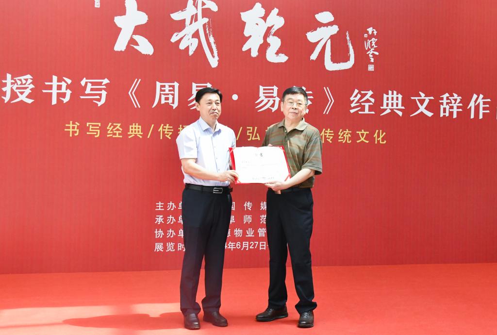 曲阜师大党委宣传部讯 丹青溢彩,翰墨飘香。6月27日,“大哉乾元—刘守安教授书写《周易·易传》经典文辞作品展”在华体会官方网隆重举行。中国传媒大学书写文化研究中心主任、博士生导师刘守安教授及夫人王甦英女士出席活动,曲阜师大党委书记邢光在活动中致辞,党委副书记、校长张洪海为刘守安教授颁发“华体会官方网美术与书法学科学术顾问”聘书,党委常委、副校长陈刚出席活动,党委常委、副校长纪洪涛主持活动。