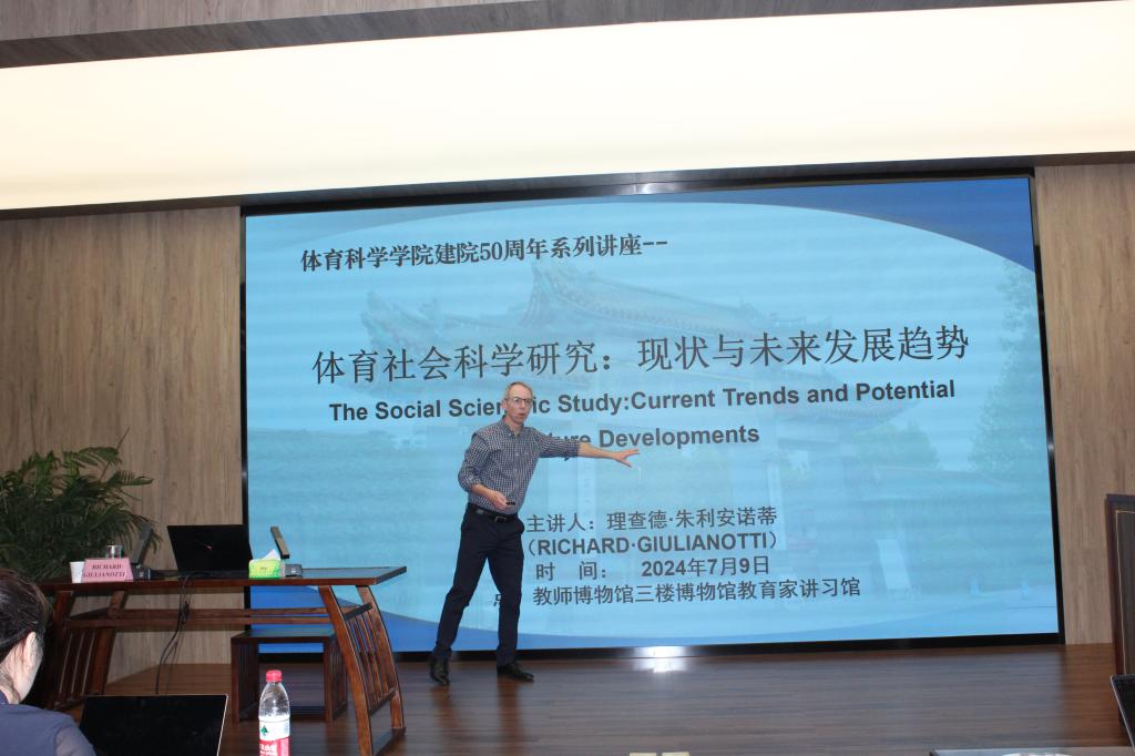 仪式结束后,理查德·朱利安诺蒂院士为曲阜师大师生作了题为《体育社会科学研究:现状与未来发展趋势》的学术讲座。理查德院士指出,体育社会科学的研究范围正在不断扩大,研究方法也在不断创新,体育社会科学的发展需要借助心理学、社会学、经济学等多学科的理论与方法,以更全面地理解体育活动对社会的影响;同时,随着大数据和人工智能的应用,体育社会科学的研究将更加精准和高效。此次讲座为学校师生提供了宝贵的学术交流机会。