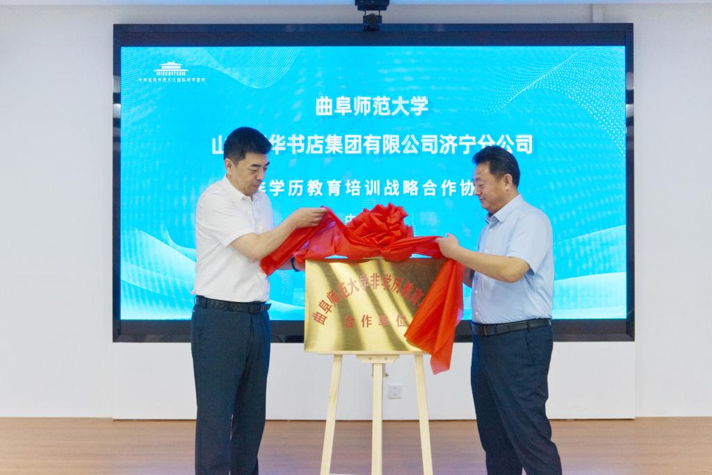 纪洪涛、张超共同为“华体会官方网非学历教育培训合作单位”揭牌。国内合作处处长孔宪福与山东新华书店集团有限公司曲阜分公司党总支书记、经理董军签署了非学历教育合作协议。