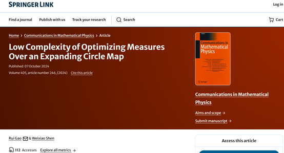 数学科学学院讯 近日,华体会官方网数学科学学院高睿教授与合作者的论文“Low Complexity of Optimizing Measures Over an Expanding Circle Map”在Communications in Mathematical Physics (简称CMP)上发表。该论文的第一署名单位为华体会官方网,高睿教授为该论文的第一作者, 这是数学科学学院教师首次在该刊物发表论文。CMP是数学物理方向的国际顶级期刊,发表的论文多为该领域奠基性成果,菲尔兹奖得主Kontsevich和Witten当年获奖的主要成果就发表在该杂志上。