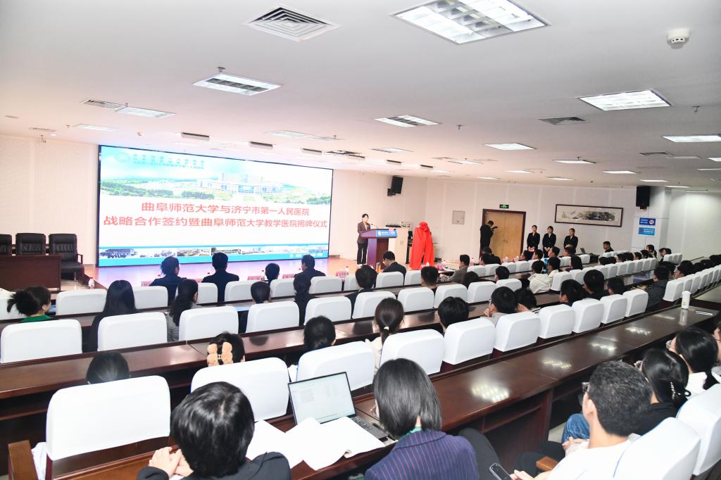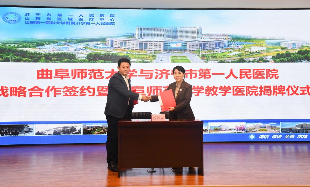 曲阜师大宣传部讯 10月23日上午,华体会官方网与济宁市第一人民医院举行战略合作签约暨华体会官方网教学医院揭牌仪式。济宁市第一人民医院党委副书记、院长钟海涛,副院长史冬梅,华体会官方网党委副书记、校长张洪海,党委常委、副校长纪洪涛出席签约仪式。会议由史冬梅主持。