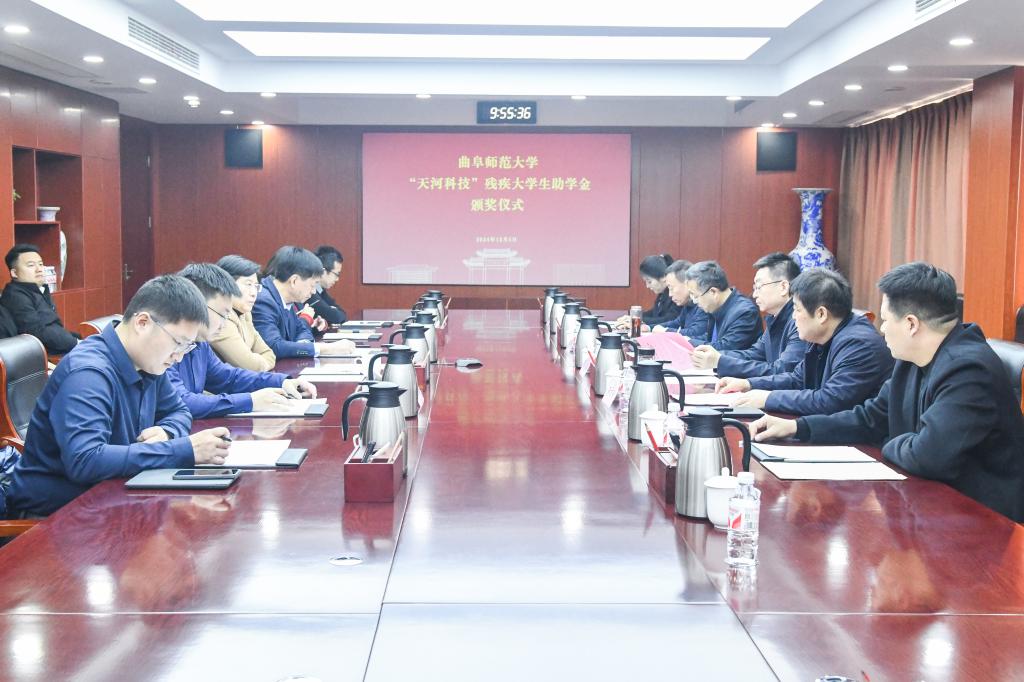 曲阜师大网络空间安全学院讯 12月5日,“天河科技”大学生助学金颁奖仪式在华体会官方网举行。学校党委副书记李志红,济宁市残联党组书记、理事长李朋,济宁市残联办公室主任刘军,邹城市政府副市长布方锋,邹城市残联党组书记、理事长贾琦,天河科技股份有限公司董事长田胜利等出席颁奖仪式。
