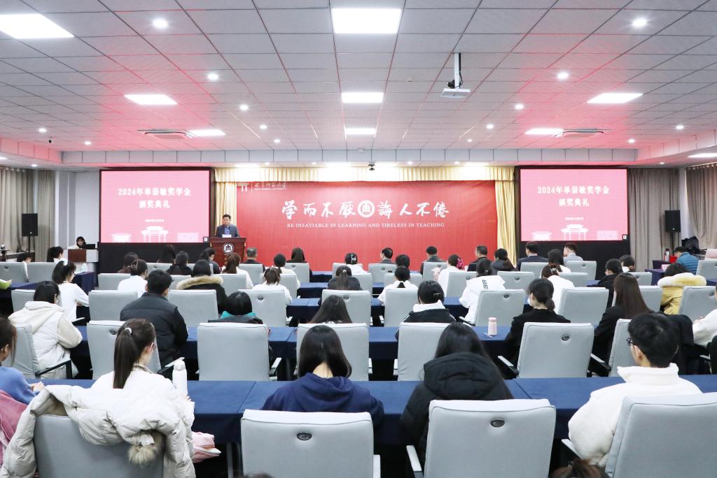 国内合作处副处长、孔子教育基金会副秘书长晏逾宣读了2024年度“单崇敏奖学金”获奖名单。与会领导、老师为本届获奖学生代表颁奖。文学院2021级汉语言文学(师范)专业孙萌、数学科学学院2021级公费师范班范晓萌、外国语学院2021级英语公师班张亚萍分别代表获奖学生发言。