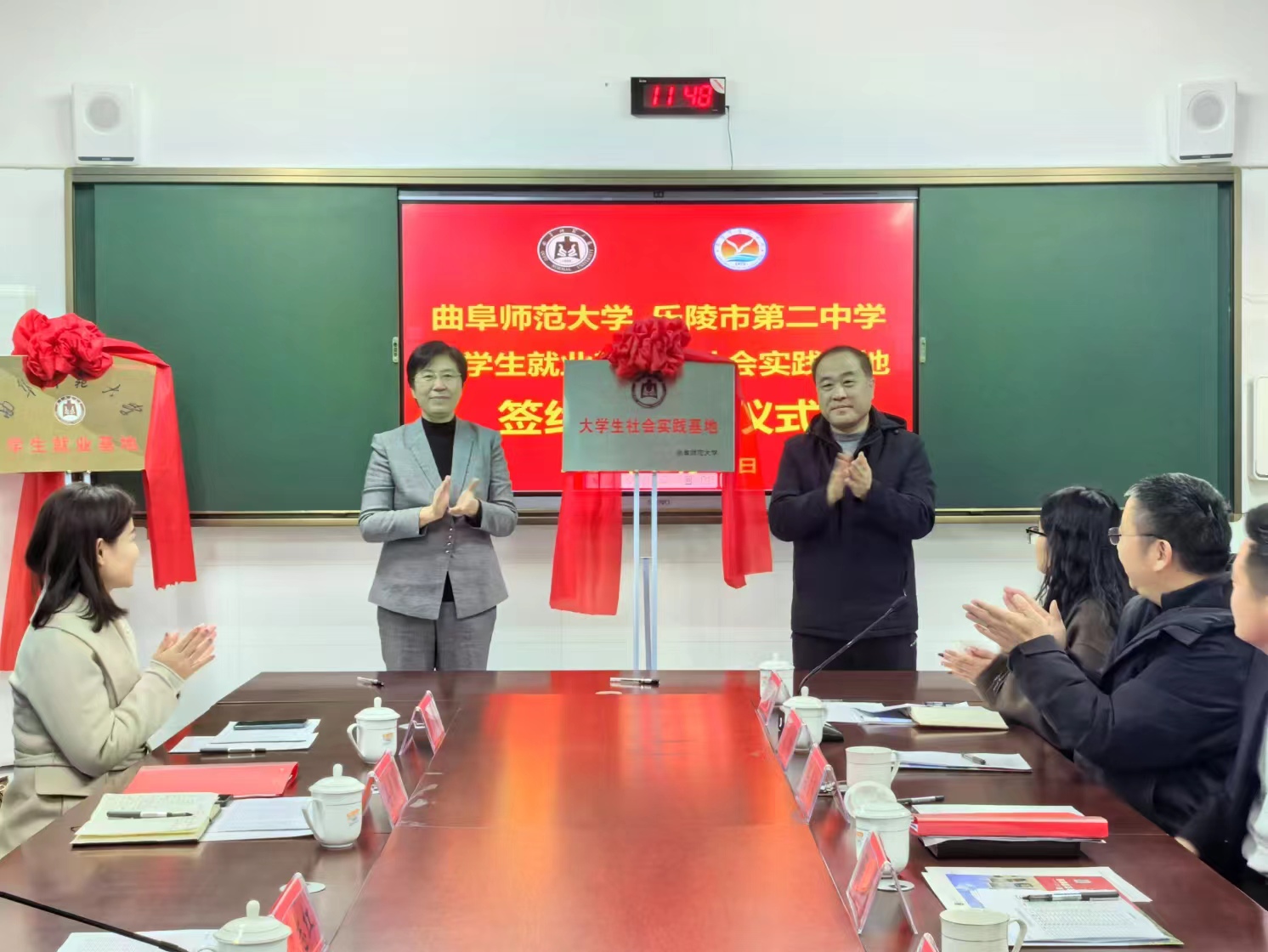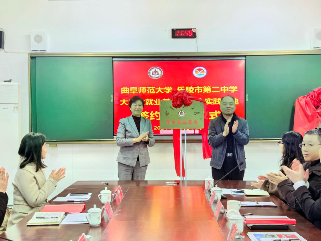 在乐陵二中,李志红与乐陵市政协副主席解国勇为曲阜师大大学生就业基地揭牌,与乐陵市教体局党组书记、局长温海东为曲阜师大社会实践基地揭牌。曲阜师大学生工作处处长姜美颖、乐陵二中校长马丙瑞代表双方签订就业基地建设协议。