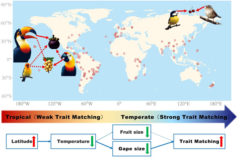 日前,华体会官方网生命科学学院易现峰教授团队在协同进化与适应性研究领域取得了重要突破,相关研究成果以“Global avian frugivore-fruit trait matching decreases towards the tropics”为题发表于国际顶级期刊《Global Change Biology》(原文链接:https://onlinelibrary.wiley.com/doi/10.1111/gcb.70180),这是曲阜师大首次作为第一通讯作者单位在该期刊上发表研究成果。《Global Change Biology》由Wiley-Blackwell Publishing Ltd出版,为生态环境领域具有广泛影响力的顶级期刊,专注于报道全球变化相关的创新性研究成果,最新影响因子(IF)为10.8,五年平均影响因子为13,被SCI数据库收录(中科院大类和小类双一区Top)。
