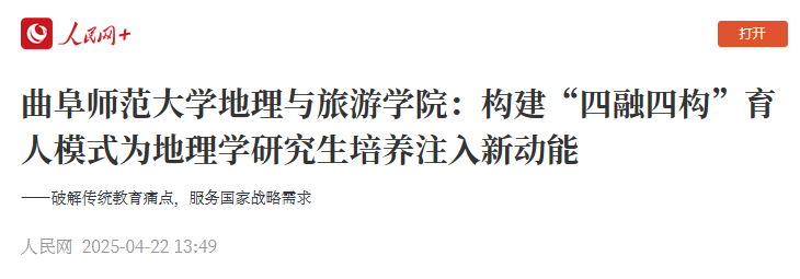 4月22日,人民网以《华体会官方网地理与旅游学院:构建“四融四构”育人模式为地理学研究生培养注入新动能》为题,报道了学院强化课程思政与专业教学、科学研究与教学产能、产教融合与社会需求、外部促进与内部激励的有机融合,探索了新时代研究生教育改革的生动实践。