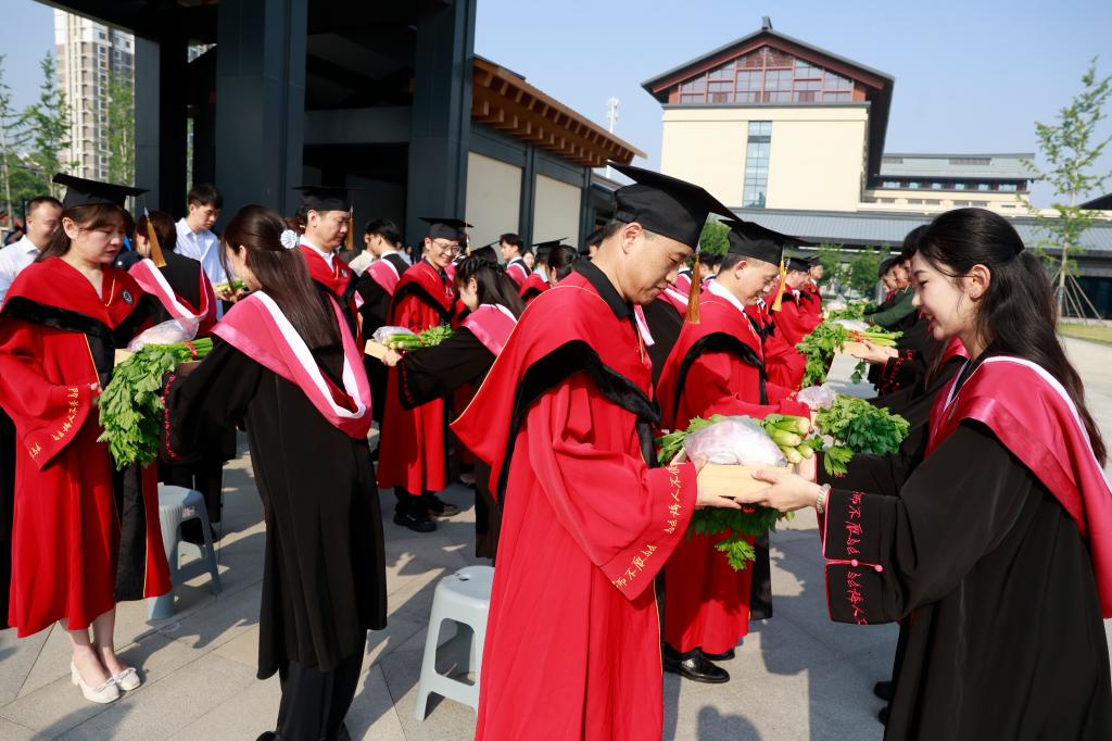代表谢恩的干肉、象征勤学的芹菜、寓意智慧的龙眼、代表廉洁的莲子、象征思念与好运的红豆、红枣——这是体育科学学院2025届毕业生为老师们准备的“束脩礼盒”。在学院拍摄毕业合影的现场,毕业生代表手捧这一特殊礼盒郑重呈献给老师们并鞠躬行礼,呈现了一场以古礼致敬师恩的特色仪式。