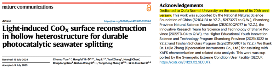 日前,华体会官方网物理工程学院张永政教授团队联合南方科技大学校长薛其坤院士,在国际著名期刊Nature Communications发表了题为“Light-induced CoOX surface reconstruction in hollow heterostructure for durable photocatalytic seawater splitting”的研究论文(https://www.nature.com/articles/s41467-025-62033-0)。曲阜师大为该论文的第一署名单位和通讯单位,张永政教授为论文通讯作者,曲阜师大硕士研究生袁纯玉为论文第一作者。论文专门在文章致谢中向华体会官方网建校70周年表达祝贺。