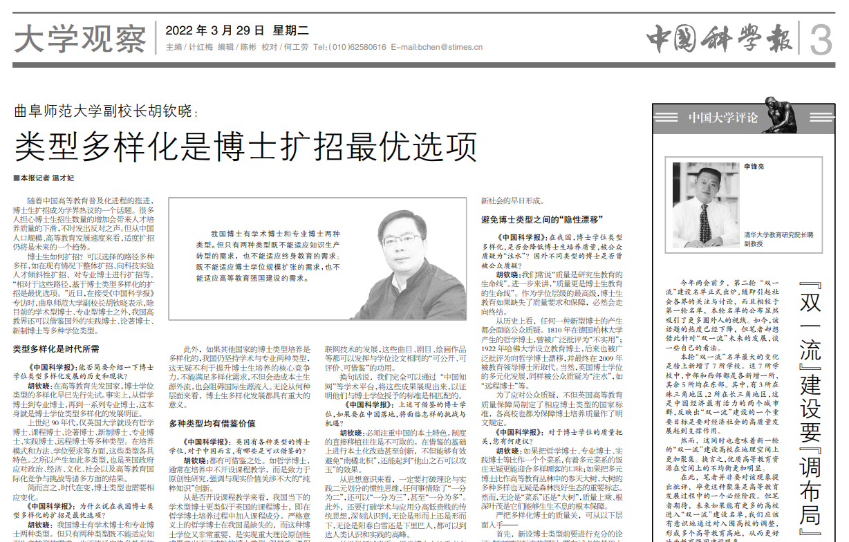 【中国科学报】华体会官方网副校长胡钦晓:类型多样化是博士扩招最优选项