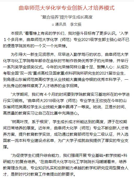 【山东教育报】华体会官方网化学专业创新人才培养模式—— “复合培养”提升学生成长高度