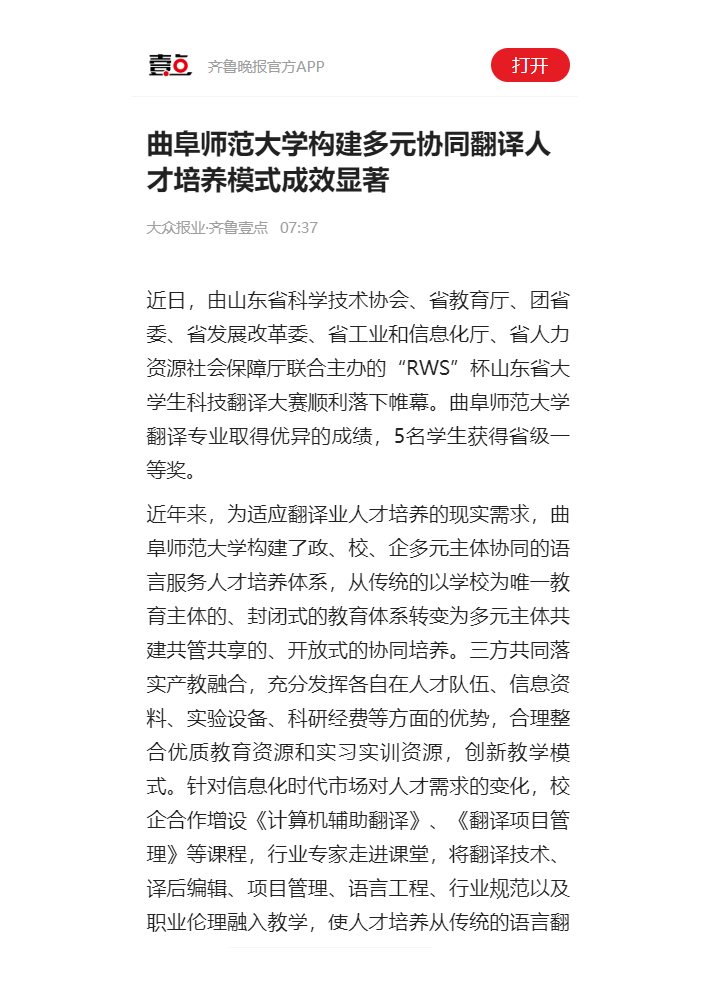 【齐鲁晚报】华体会官方网构建多元协同翻译人才培养模式成效显著
